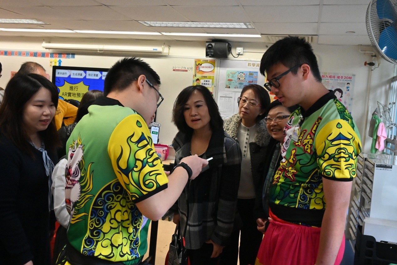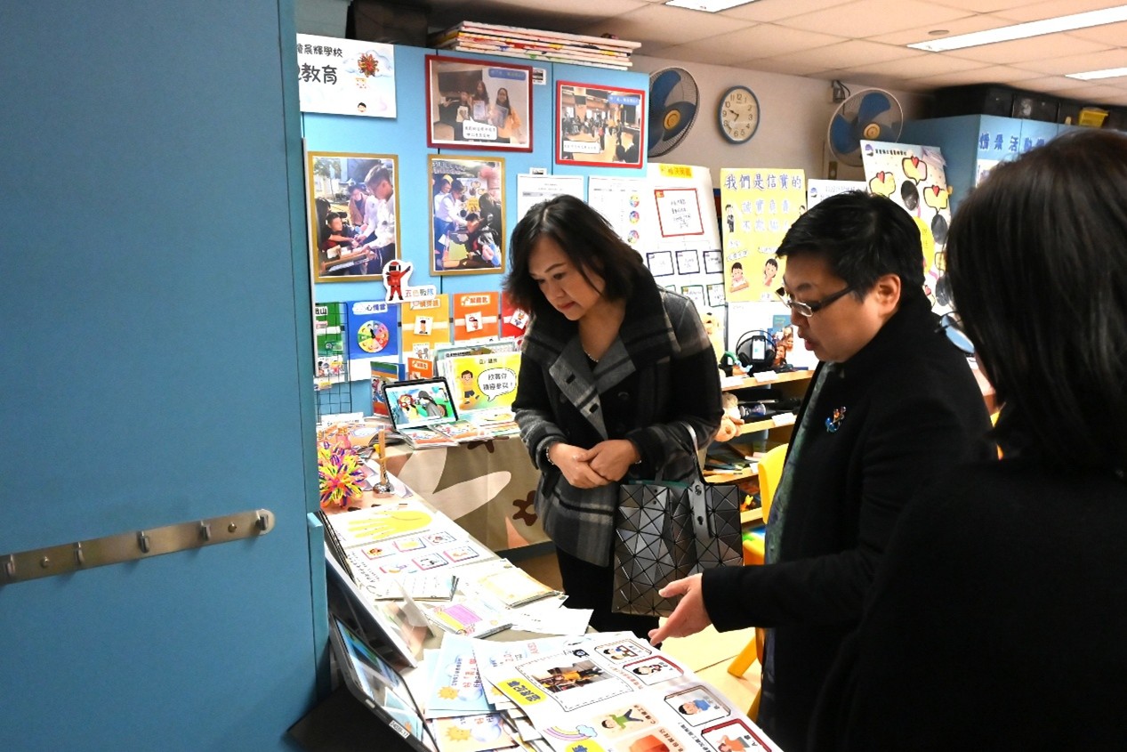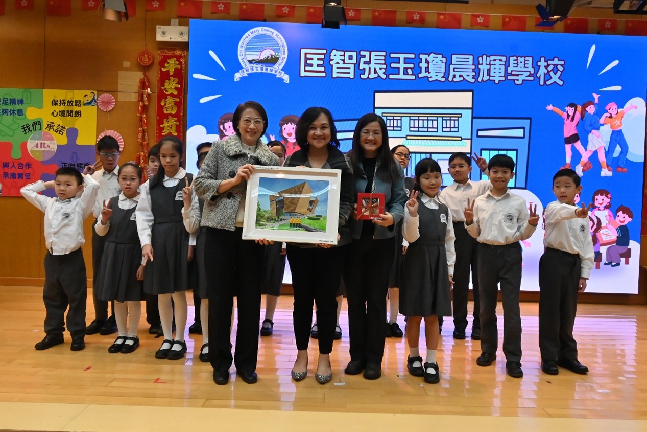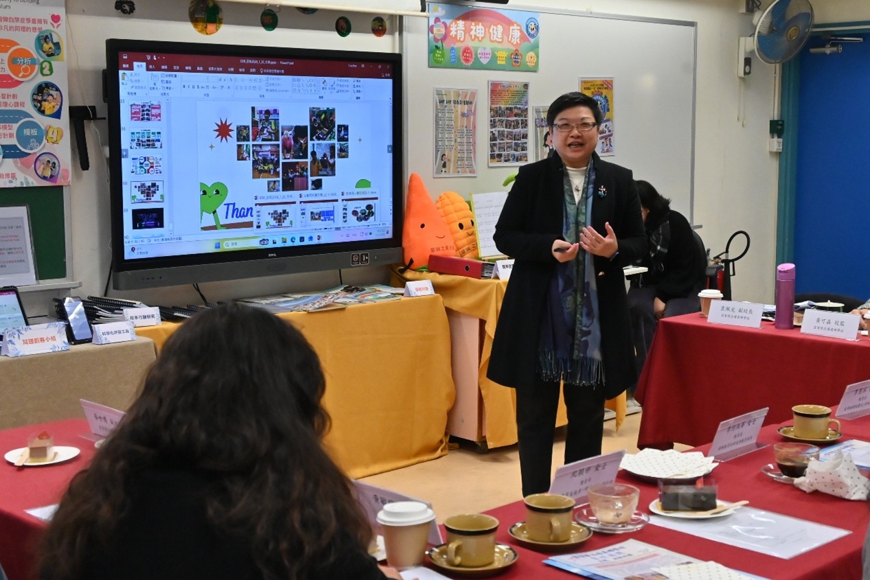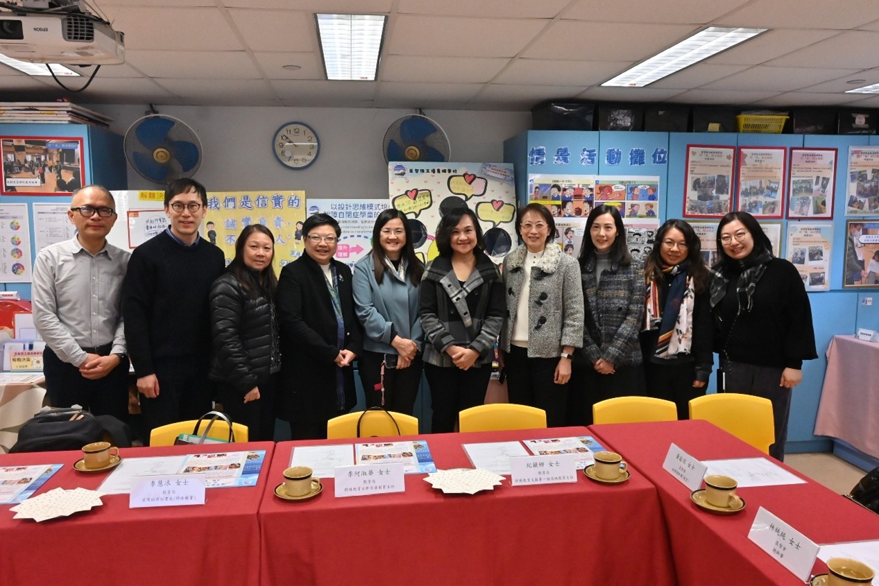 本校於 1 月 22 日上午有幸接待教育局首席助理秘書長(特殊教育)李慧冰女士,以及教育局特殊教育分部首席教育主任李何淑華女士、特殊教育支援第一組高級教育主任紀穎妍女士和特殊教育支援第二組首席督學楊家韋先生蒞臨參訪。校長及教職員向來賓簡介學校的辦學理念與特色發展,包括生涯規劃教育、價值觀教育、創新科技與新科技於學與教的應用,以及精神健康教育的實踐策略,並安排嘉賓參觀校園、觀課及欣賞學生表演,讓教育局同工深入了解本校的教與學成果。